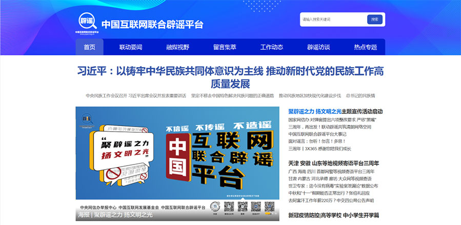 中國互聯(lián)網(wǎng)聯(lián)合辟謠平臺于8月29日全新改版上線(xiàn)。此次改版以平臺思維、服務(wù)思維、用戶(hù)思維為引導,逐步向覆蓋面廣、涵蓋領(lǐng)域全面的網(wǎng)絡(luò )聯(lián)動(dòng)辟謠工作平臺建設優(yōu)化,專(zhuān)業(yè)化、可視化水平有了新的提升。