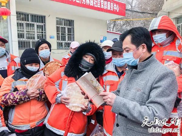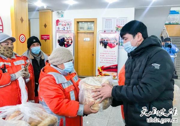 工作隊隊員與馕店老板阿巴拜科日·阿卜杜吾普爾一起將馕送到了保潔員手中,不停地叮囑保潔員們注意防寒、保重好身體,在新年到來(lái)之際向保潔員們表示節日的祝福和新年的慰問(wèn)?!胺浅8兄x阿巴拜科日·阿卜杜吾普爾給我們送來(lái)的馕,送來(lái)的關(guān)心,我們雖然常常早出晚歸,但現在社會(huì )各界對環(huán)衛工人的關(guān)心、理解和支持越來(lái)越多,我們也會(huì )用自己的微薄之力給居民營(yíng)造干凈優(yōu)美的城市環(huán)境?!苯舆^(guò)凝聚著(zhù)濃濃愛(ài)心的馕餅,保潔班長(cháng)何星修開(kāi)心不已并對阿巴拜科日·阿卜杜吾普爾的慷慨義舉表示最衷心的感謝。