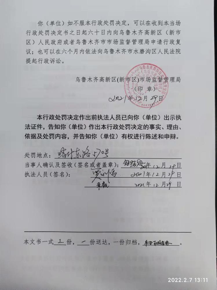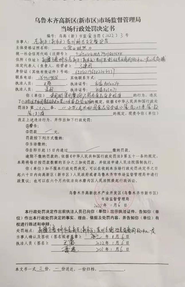 《當場(chǎng)行政處罰決定書(shū)》文號:烏高(新)市監食當罰〔2022〕3號。