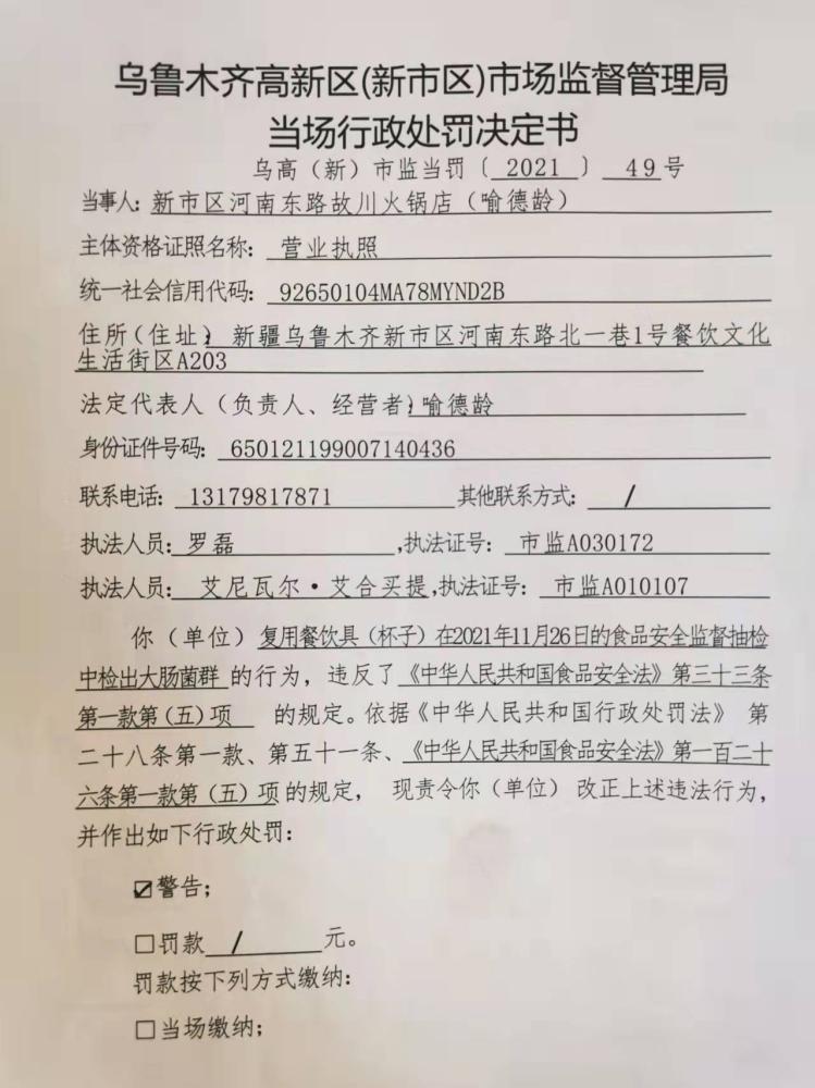《當場(chǎng)行政處罰決定書(shū)》文號:烏高(新)市監食當罰〔2021〕49號。