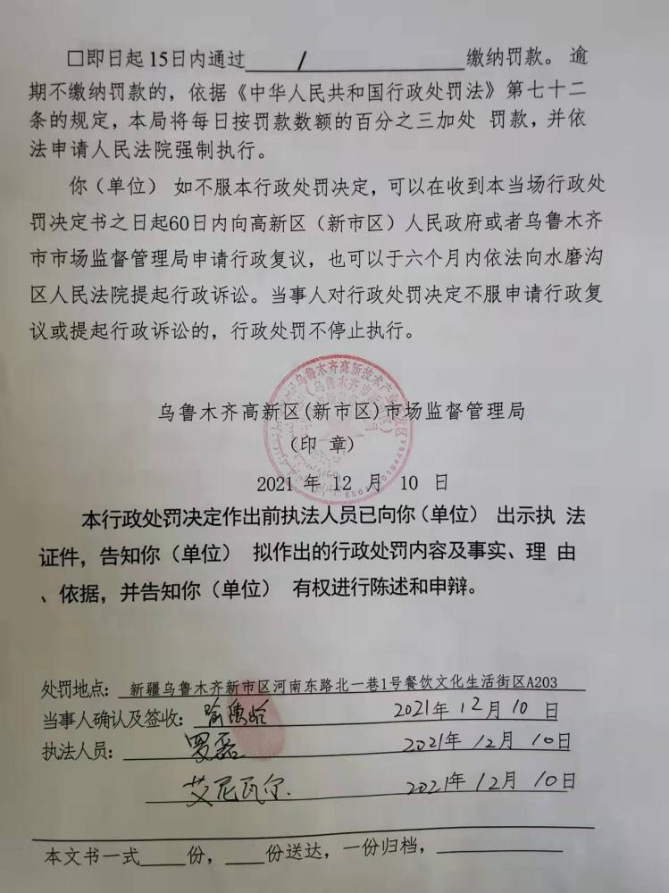 《當場(chǎng)行政處罰決定書(shū)》文號:烏高(新)市監食當罰〔2021〕48號。