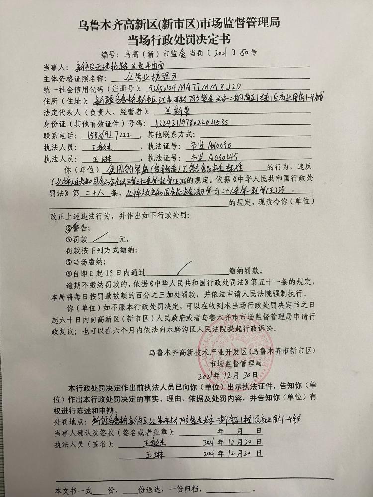 《當場(chǎng)行政處罰決定書(shū)》文號:烏高(新)市監食當罰〔2021〕50號。